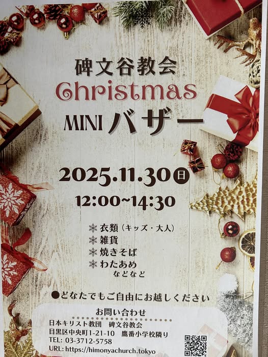 日本基督教団碑文谷教会では、来週日曜日11月30日にバザーを行います。焼きそばや綿あめの販売も行います。碑文谷教会は鷹番小学校のとなりです。お近くの方はぜひお立ち寄り下さい。